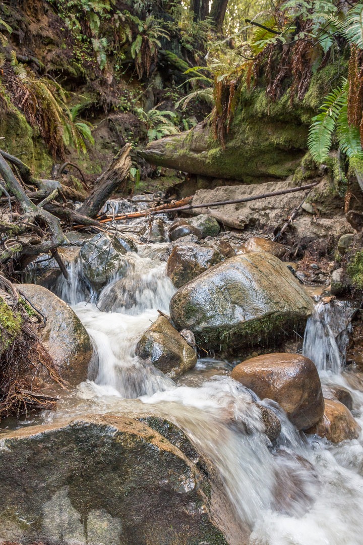 A serene forest with towering redwoods, luscious green ferns and clover that line the path awaits your arrival. This trail is well marked and fairly easy going. The last third of the way is where you will find most of the elevation change. This ascent takes you out of the redwood groves and into pine and mountain chaparral where it eventually connects with Pine Trail. Take this trail for some great views of the park, or to continue to the campground.