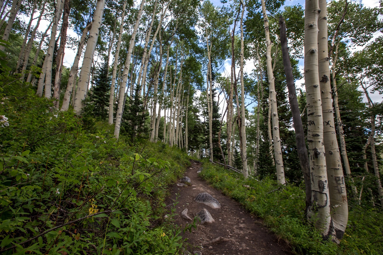 Short hike through a ski resort. Beautiful aspen trees and wildflowers.