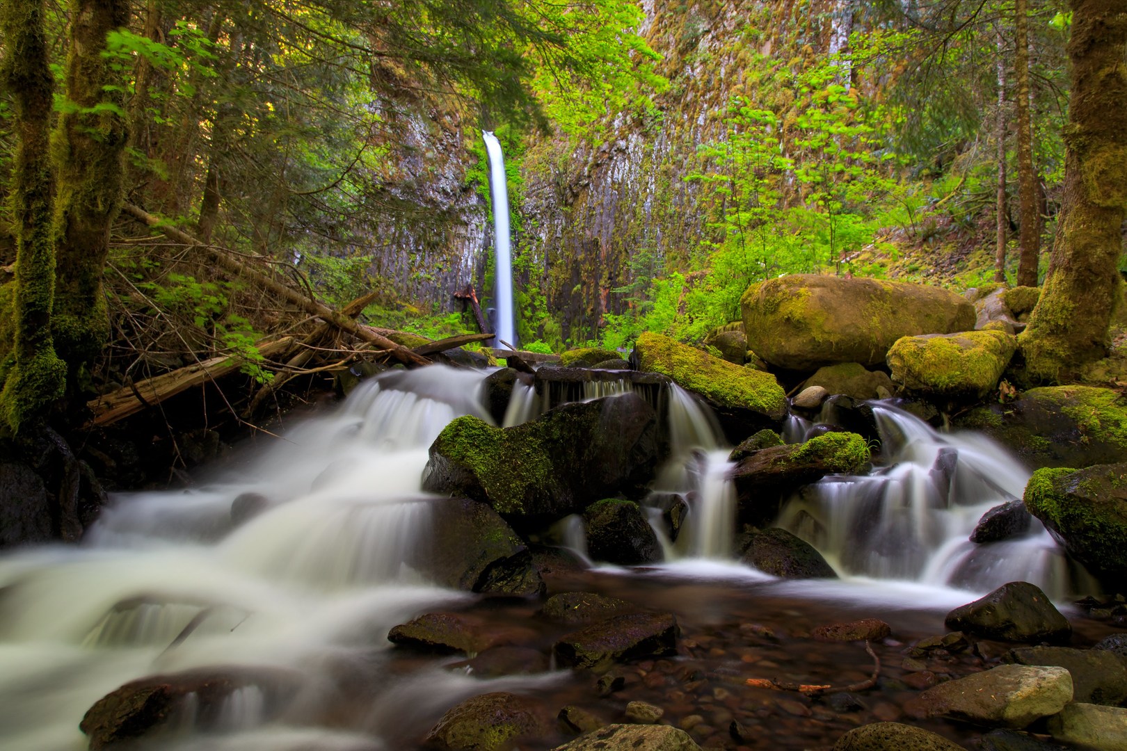 Once used as a municipal water source for the small town of Cascade Locks, the falls and creek that drop from the Benson Plateau earned its name because the creek bed went dry when its flow was diverted into pipes.  Dry Creek flows again, while remnants from the original diversion system can still be seen near the base of the falls.