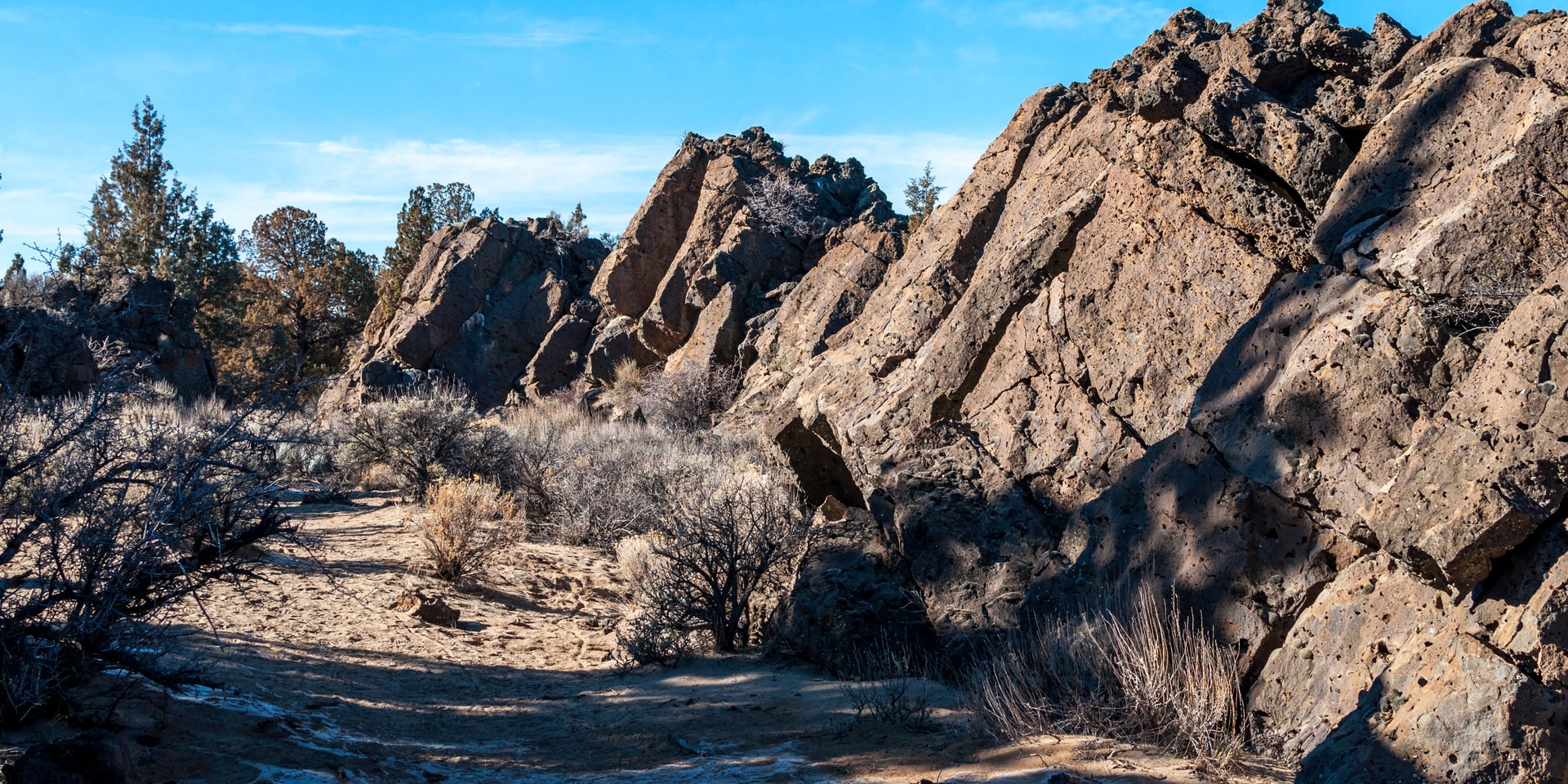 When you venture out to the Badlands just 16 miles east of Bend, you'll be treated to a harmonious blend of ancient juniper trees, vibrant lichen growing on contorted lava rocks, and a geological history that makes even the dirt under your feet seem interesting. Roughly 80,000 years ago, lava from the main vent in Newberry Volcano traveled underground through the ancient Arnold tube system (Arnold Ice Cave and Lava River Cave being remnants of the tube). When the lava reached the area now known as the Badlands, it spewed to the surface in every direction creating a 360-degree spread that covered the landscape. The craggy and unforgiving terrain was further impacted by another geologic event: 7,700 years ago, Mount Mazama (Crater Lake) erupted and violently expelled plumes of ash that drifted toward central Oregon. Much of this ash settled on the ground to become the Badlands soil.