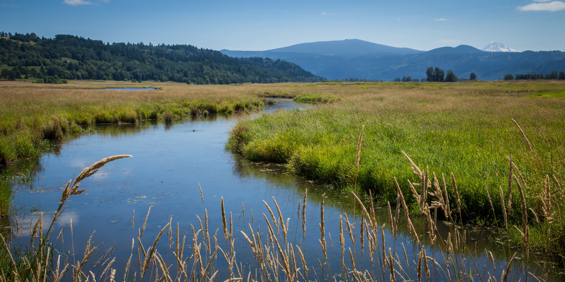 The refuge consists of floodplain and wetland habitat that was historically Columbia River turf during seasonally high flows.  Currently the area is a mix of dense stands of cottonwoods and open expanses of native grasses and ponds through which winds a walking trail.  The trail itself consists of compacted gravel and is very accessible for wildlife watchers of all abilities.  You will also find interpretive stations and assorted sculptures interspersed throughout the loop.  Over all of this presides the dominant figure of Mount Hood, capping the sense of the refuge’s specifically Northwest location.