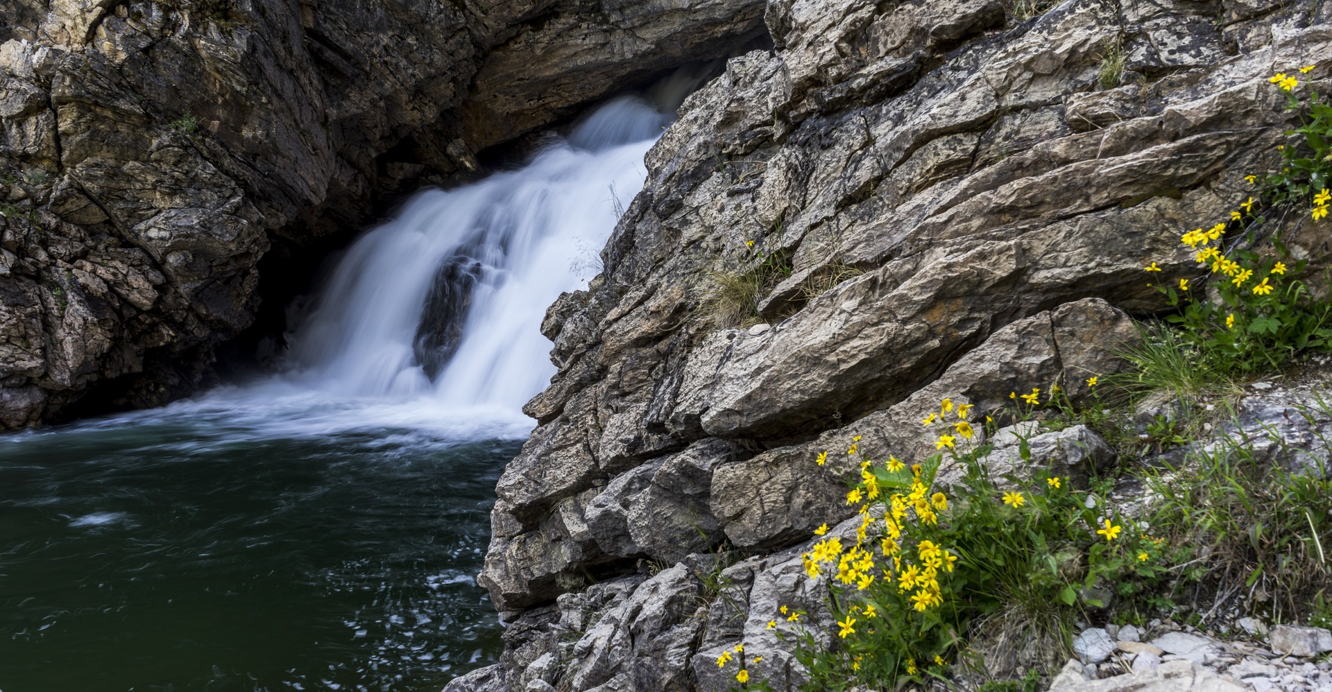 The parking area has great exhibits (displayed in both English and Blackfeet languages) about Running Eagle, a female Blackfeet warrior and leader. The trail has two routes: a nature trail with exhibits about the local plants and how they were used by the native people, and the trail to Trick Falls. This trail crosses the creek and climbs up a bit to the base of the falls. When the water is high early in the season, this becomes a double falls, with water flowing over the top and out of a large opening in the rock below. By midsummer, the upper falls have dried and just the lower falls are running.