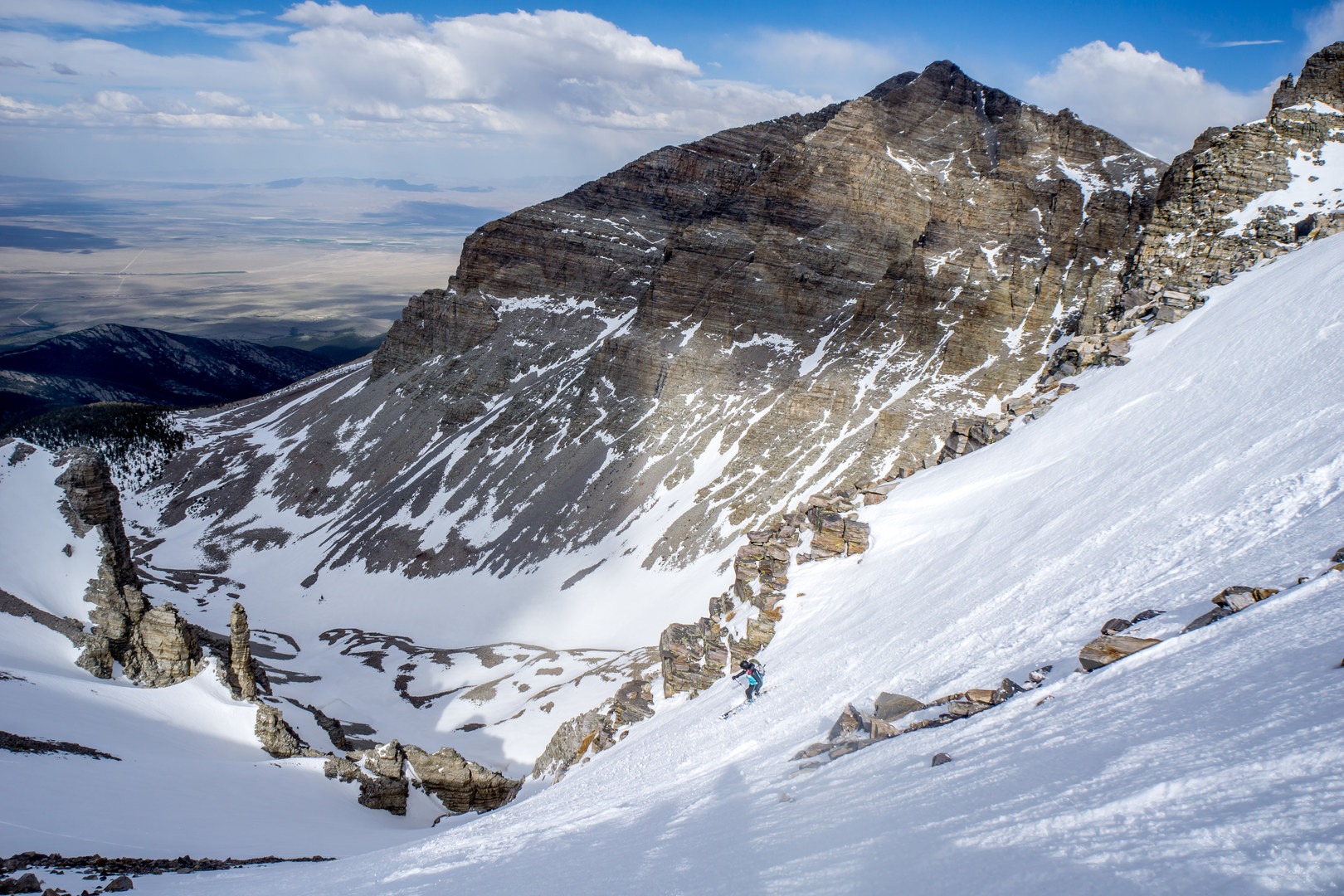 Wheeler Peak (13,064 feet) is the tallest peak in the park, and it is one of the most impressive mountains in the Lower 48. Hiking Wheeler Peak can be done as a day hike starting from the Wheeler Peak Campground at 10,000 feet. To ski Wheeler, however, requires much more effort. The National Park Service closes the access road to the typical trailhead when snow is still abundant, making the winter hike up to Wheeler a serious adventure. Depending on snow levels, it makes sense to hike from the Upper Lehman Campground when possible. This depends on how high up the road you can drive. The elevation gain from Upper Lehman is about 6,000 feet, but the route is direct and beautiful.