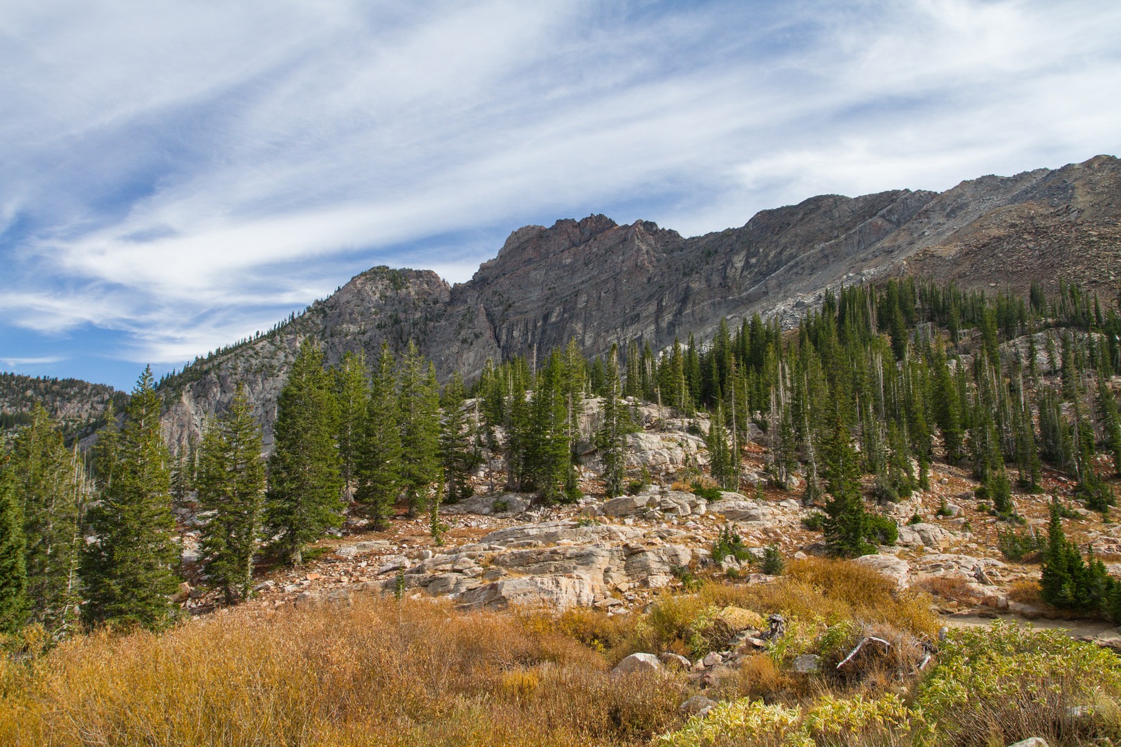 The face of Devils Castle, a rugged cliff of dark gray limestone, makes a magnificent backdrop for Albion Basin. Alta skiers know Devils Castle for the open powder fields that form on its north-facing lower slopes. In the summer and fall, it’s a destination for adventurous hikers seeking one of the best scrambling routes in the Wasatch.