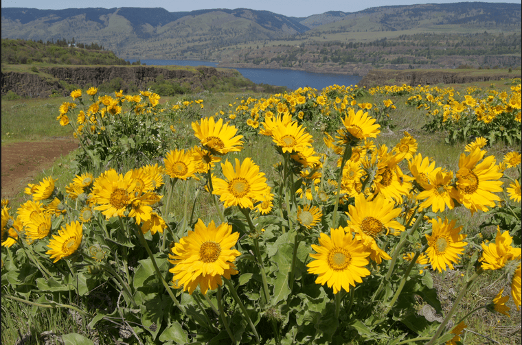 Beyond, after the right turn at 2,300 feet, lie the meadows so often decorating calendars and wildflower book covers. But look beyond the maze of balsamroots to find the fuzzy purple flowers of ball-head phacelia, especially early in the month. As you pass Windy Point (or The Puppy) at 2,500 feet, gaze up to your right at the towering fins of basalt at around 2,700 feet to spot the shocking pink of rock penstemon, a plant that adheres to rock outcroppings here and on Table Mountain. It should be awarded the honor of “most colorful” amongst the many blooms you will find along these Gorge trails (think Vera Wang and Versace, not Old Navy or REI). At top, the shiny yellow flowers decorating the well-trodden meadows are western buttercups.