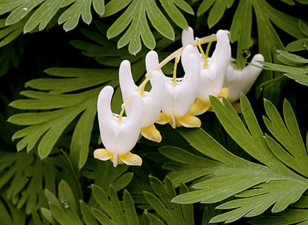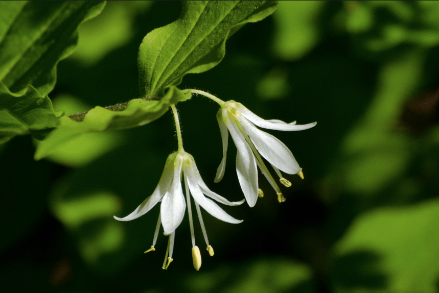 After the sign and convenient bench at 1,900 feet, early in May look for the fancifully-named Dutchman’s breeches, especially on the right as you steeply ascend the trail, then make a right-hand turn at 2,000 feet. With some imagination, these bleeding heart relatives do look amazingly like the upturned pantaloons commonly depicted in paintings of 17th century Holland. After this turn, and accompanying you through the steep uphill trail from 2,100 to 2,300 feet are yellow stream (or wood) violets (most of our violets, despite their name, are yellow) and its frequent companion, candy flower, with white petals softly engraved with peppermint-like pencil-thin pink stripes.