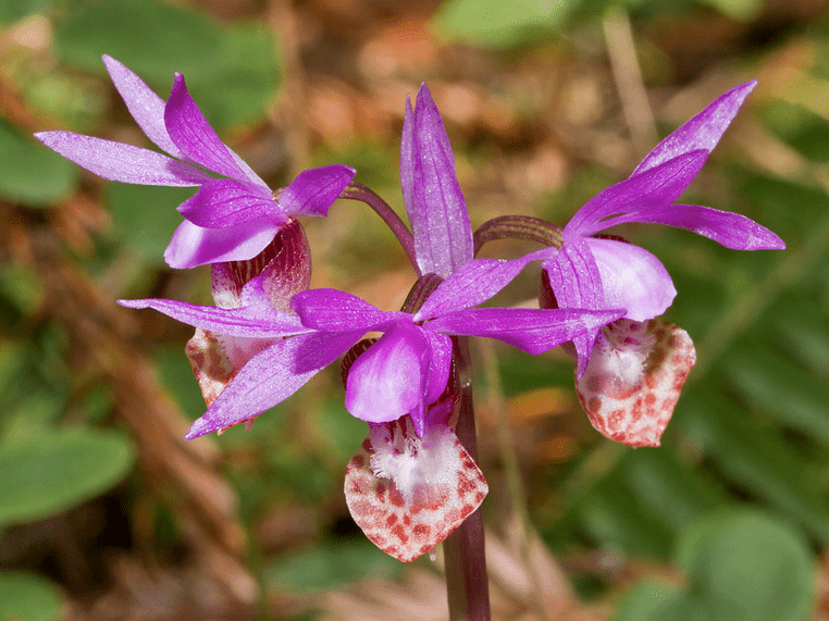 On the plateau at about 850 feet, the predominant flower is Hooker’s fairybells. You will need to peek underneath its drooping pointy leaves to discover the shy white bell-shaped flowers which lend their name to this brushy 3 foot tall plant. Also on this plateau, a most unusual saprophyte exists, ghostly white throughout. It is the phantom orchid, rarely seen except in a narrow longitudinal range along the eastern crest of the Cascades. Saprophytes such as the three coral roots (also in the orchid family) inhabiting out forests, lack chlorophyll and thus are not green in any of their parts; they have no need of sunlight as they are fully sustained by the fungi and bacteria in the soil which supply minerals and water to the pant in exchange for the carbohydrates the saprophyte supplies to them. We do have other orchids in our mountains, though they cannot rival in color or size those of tropical realms. One such may still be out in the forests of early May between 900 and 2,000 feet, the beloved Calypso orchid (or fairyslipper), with its diminutive pink tongue and red-spotted petals.