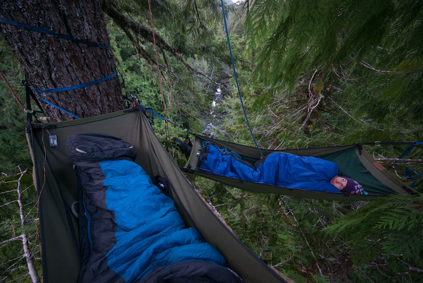 On the last morning of my 38th year I awoke 75 feet up inside the arms of a tree. The arms of three trees actually: one towering Douglas fir, its canopy crowned in cones and its trunk deeply rutted like the lined and weathered hide of an aged elephant, plus two close-by slender cedars, their fragrant and feathery fringes wagging contentedly above, below, and between our skillfully strung arboreal beds. Our Treeboat beds. The Treeboats are technical hammocks designed to safely suspend reclining climbers. They’re capable of supporting 5,500 pounds (each!) while still being gentle to the protective outer bark of the supporting trees. It was in these Treeboats that my partner, JQ (John Waller, wizard of the pretty pixels), and I, were lulled to rest by the rush of the tumbling Opal Creek below us and where we nestled into our mummy bags to dream, in subtle sway with a barely-there September breeze.