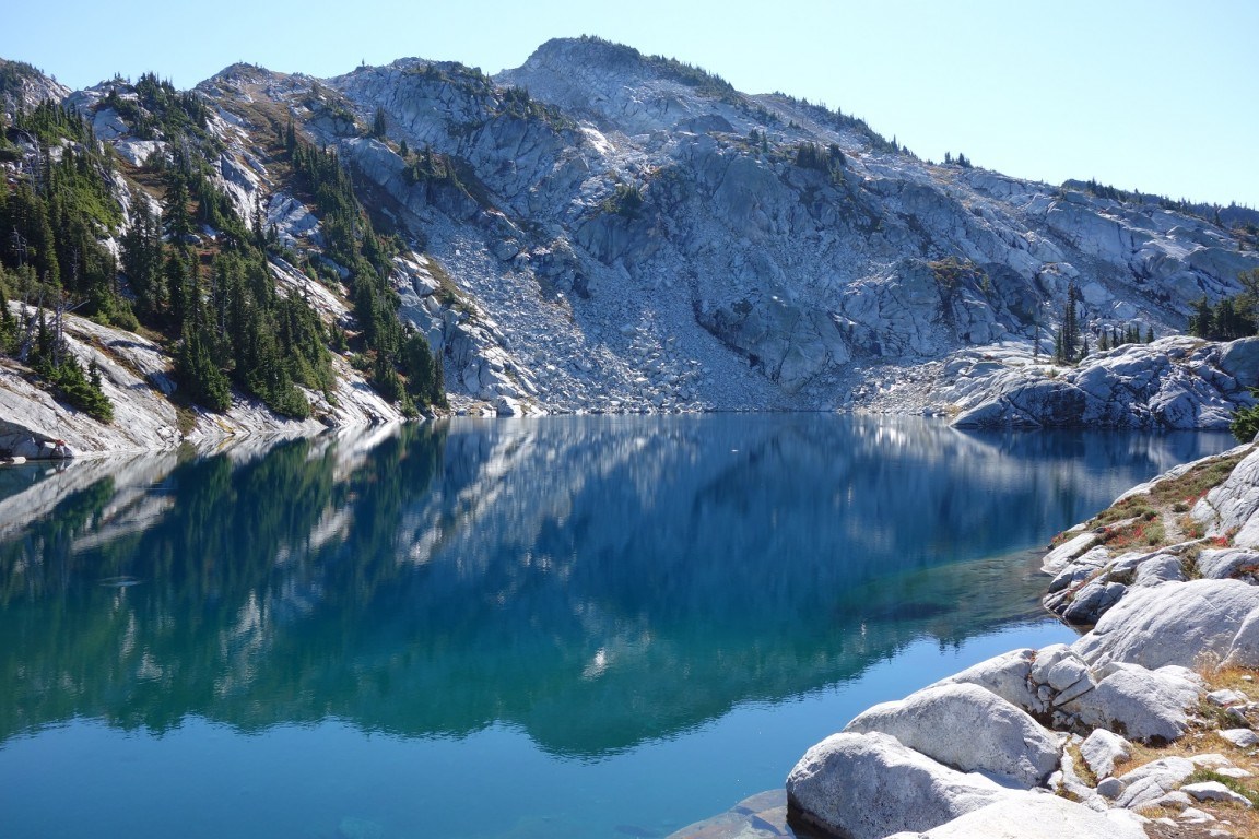 Fed and warm, we were finally ready to break down camp and head up the trail to Robin Lakes. As we hiked, the skies cleared, revealing breathtaking views of Cathedral Peak, Mt. Rainier, and Mt. Adams. The trail was steep and rugged, but numerous cairns made it straight-forward enough to follow.