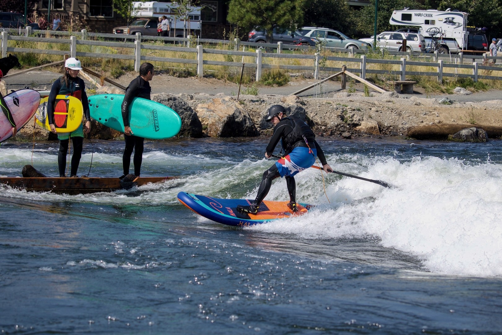 I’ve been paddleboard surfing in Colorado and West Virginia for a few years, but short board river surfing was new to me. I’d tried it once in Boise and managed a few rides that lasted a couple of seconds. The Green Wave in Bend was a beautiful feature. The wave is about 40 feet wide, steep, and glassy. It took some time to learn how to get in using the concrete walls. After hitting the flaps forming the wave a few times, I learned to fall flat. My next lesson was that if you want to make it to shore without swimming the next few shallow features, ditch your board (as long as it’s on a leash) and swim to shore.