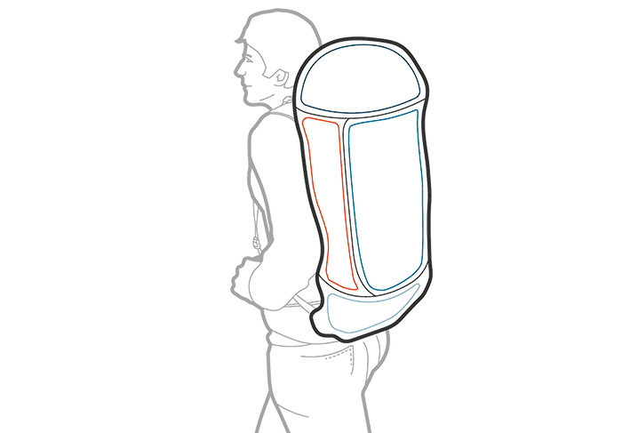 - Back - Heavy equipment such as quickdraws, camming devices and other climbing equipment should be as close to the body as possible without the metal parts being able to push into the back (position across the backpack). This optimally transfers the load to the pelvis via the hip belt. At the same time, the heavy equipment should not be too high up, otherwise the backpack will start to sway.