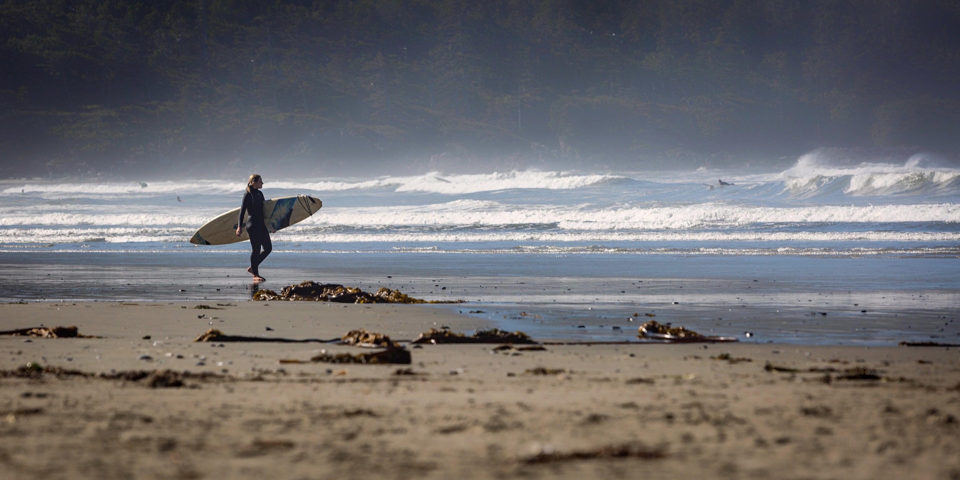 Cox Bay is a popular beach and surf break just outside the boundary of Pacific Rim National Park, a few minutes south of Tofino. While not nearly as expansive or seemingly endless as Long Beach, Cox Bay is a 1.5-kilometer-long stretch of soft sand scattered with a typically West Coast assortment of driftwood, kelp, and other tidal debris. Since it is located just outside of Pacific Rim National Park, there are a few resorts along the beachfront. The beach still has public access with free parking, and for the most part the lodgings are set back behind the row of driftwood piles deposited by the last king tide so as to allow beach-goers a sense of unspoiled natural beauty.