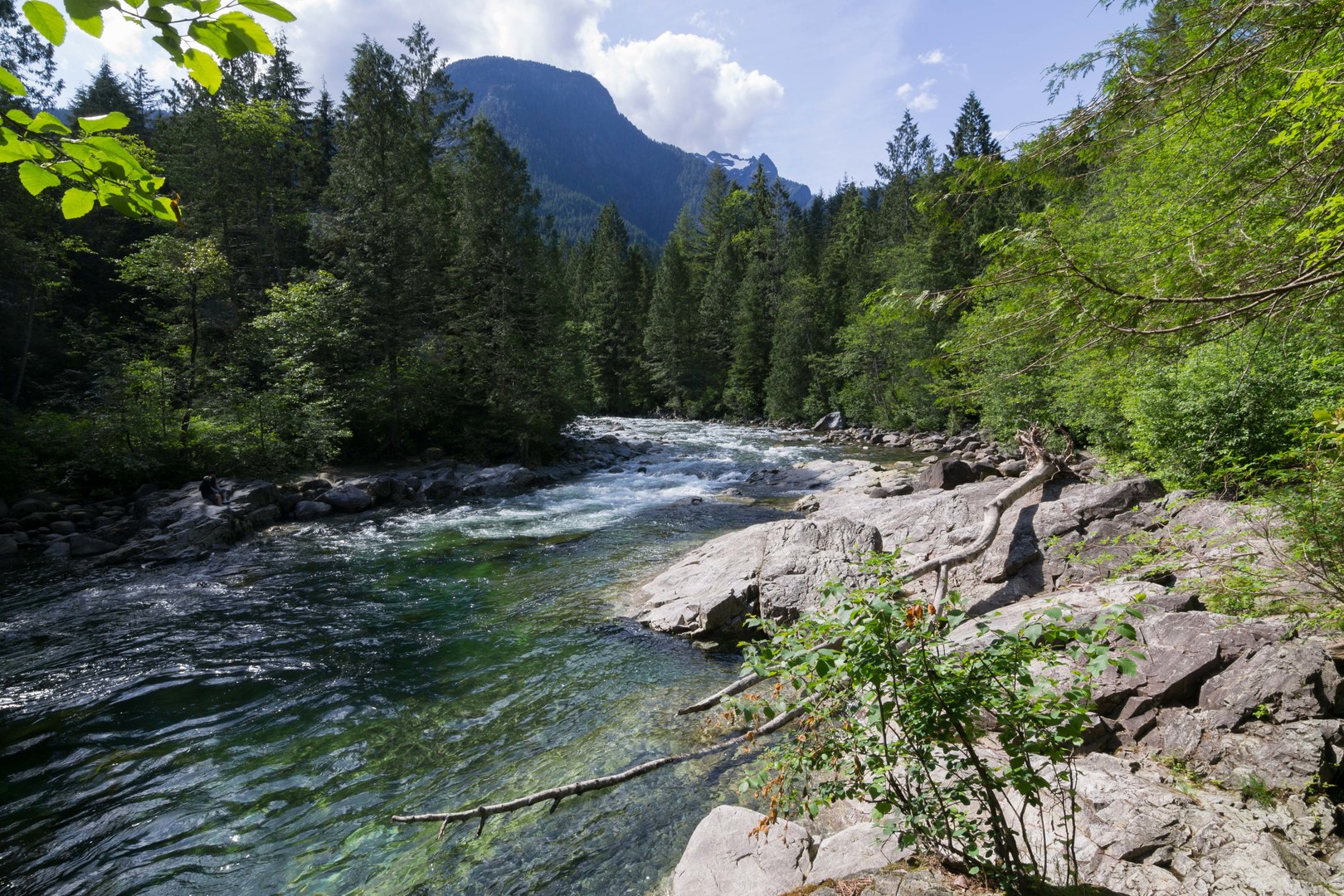 Although most hikers use North Beach Trail as a means to get to Alouette Lake's North Beach, the trail itself hosts many swimming holes and can be a destination all its own. From the North Beach and Lower Falls parking area, the trail travels along the north side of Gold Creek, following it for one km down to Alouette Lake. The waters of Gold Creek are a brilliant green, almost chartreuse in places. Vista points up the creek lead back to dramatic views of Evans Peak. Spurs off of the main trail lead down to those viewpoints and to access points to the river. Rock ledges allow for shallow bathing, and there are also many deeper spots for swimming and jumping. Be aware that the current can be swift, so exercise caution and never jump into a river beyond your swimming ability.