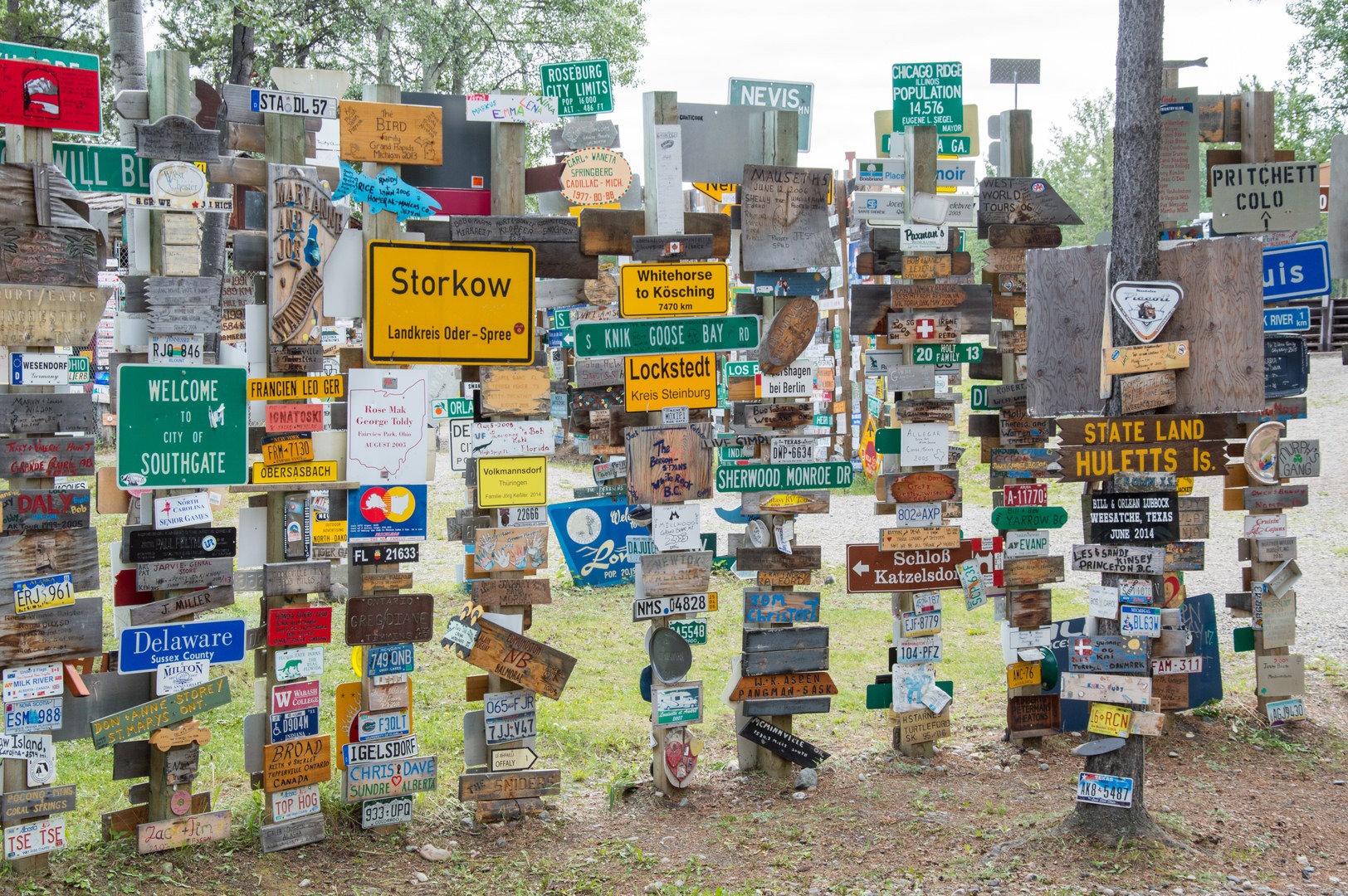 For those traveling the Alaska Highway, the Sign Post Forest in Watson Lake is a classic roadside stop. This historical attraction got its start in 1942 when the highway was constructed as a wartime effort to supply military power to Alaska. A U.S. soldier on the work crew named Carl K. Lindley was stationed at Watson Lake and repairing signposts along the road. He decided to add a sign with the direction and distance to his own hometown of Danville, Illinois, more than 4,000 kilometers away. Ever since then travelers of the Alaska Highway have been adding signs from their own hometowns, and the collection has grown to more than 70,000. In the forest you will find street signs and homemade markers from cities all over the world.