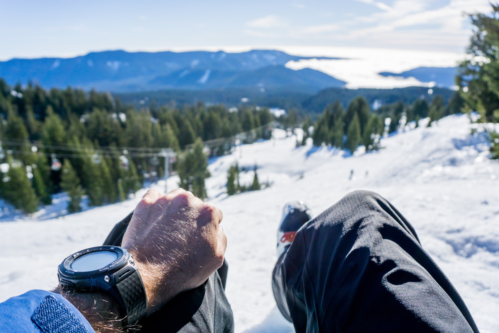 The day up at Mt. Hood Meadows Resort was phenomenal from the start. I left town early to get a spot in the lot before it was full, and I charged my watch on the way up using the USB charger in my van. The first lifts open at 9 a.m., and I was ready, sunscreen applied (it was bluebird and warm), and the watch was set to record my day with the Bluetooth connected to my phone and the Casio Moment Setter+ App running the skiing app to track runs.