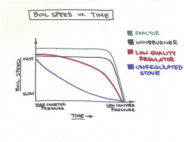 As depicted in the chart above, a stove with a well-designed regulator delivers its optimum BTUs relatively consistently, until its canister ultimately drops below its regulated level.