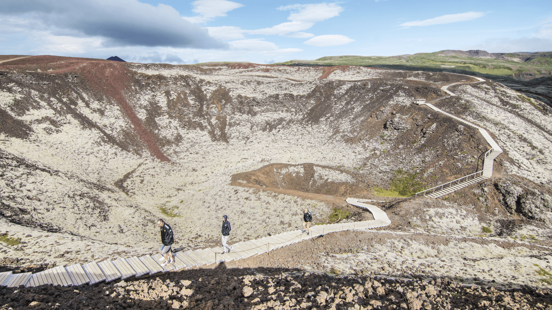 These craters are a part of the Ljósufjöll volcanic system that belongs to the Snæfellsnes peninsula. They are the most easterly craters in the system with alkali olivine basalt lava flows that cover a large portion of the surrounding Norðurárdular valley. The goal of protecting the Grábrókargígar craters is to preserve the remarkable scoria cones protruding from the landscape. The area’s vegetation is vulnerable, in particular moss vegetation, so please respect the roped-off areas and remain on the marked paths.