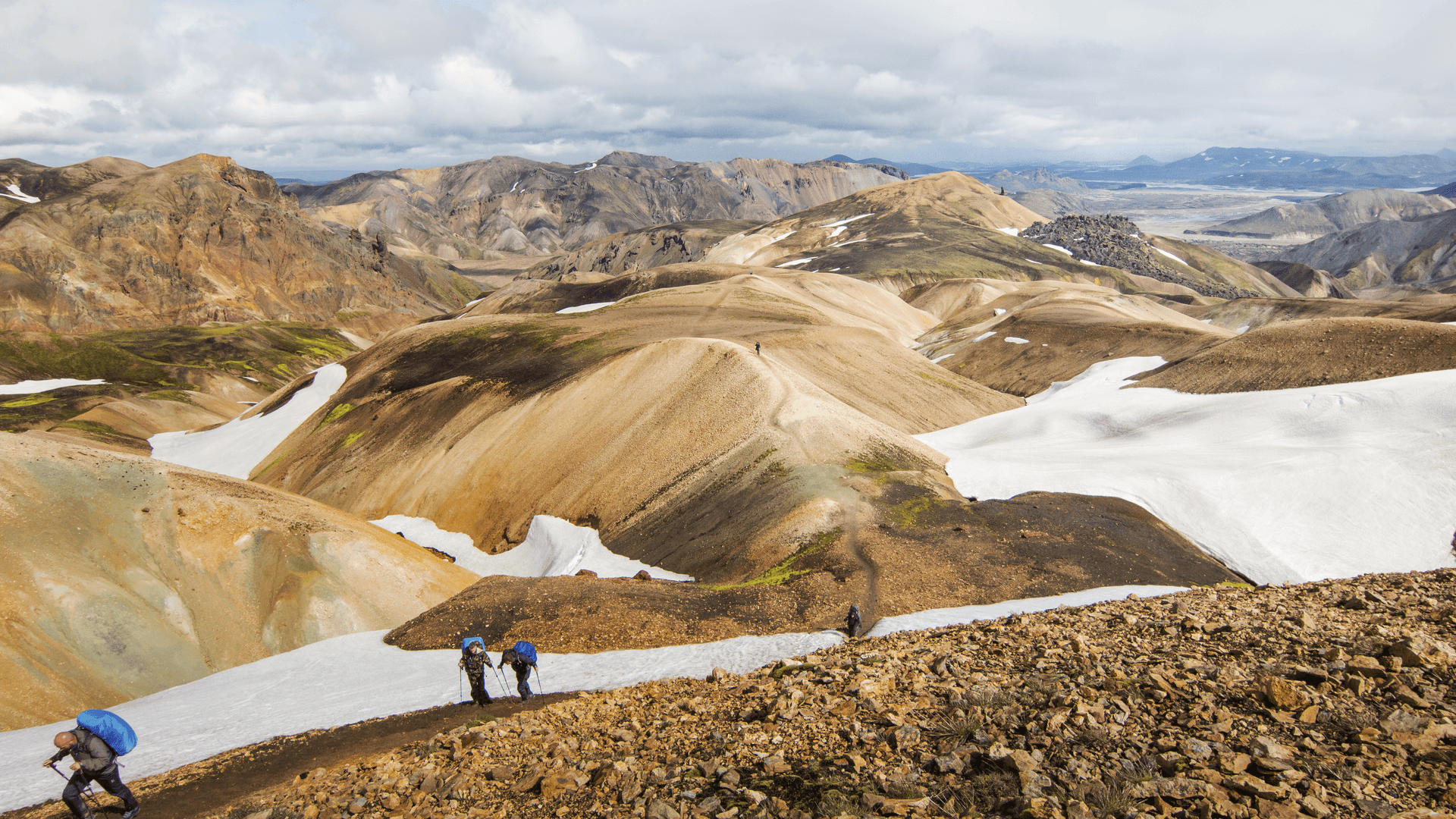 Be prepared for all types of weather conditions on this journey! In general, forecasts in Iceland are not reliable, but especially here, throughout the highlands, it is possible to experience all of the seasons within just a few hours. Everything can change momentarily, and visibility can suddenly decrease to zero. Rain gear and appropriate synthetic/wool clothing is mandatory: Your life may depend on it! Waterproofing should be of high quality, and you will want a pack cover. There are several river crossings with knee-high water, so river shoes are highly recommended. Most trekkers also choose to use hiking poles to help alleviate the constant weight of their heavy pack on their legs; this is an item that can easily outshine its value. There are several memorials to deceased hikers along the route, those who ignored the advice of rangers and who were ill-prepared for the extremes. Heed to the recommendations of camping staff and have respect for the uncertainties that can befoul this beautiful landscape.