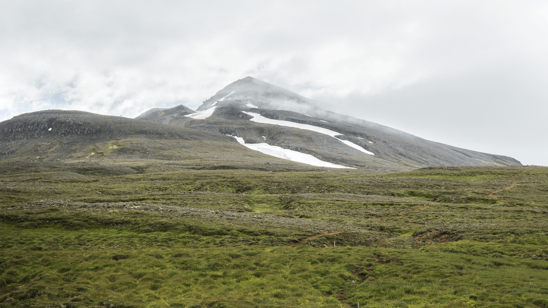 Soon the rate of your ascent will increase, and the grass will begin to disappear. The earth around you will be dirt and large rocks. Before you know it, you’ll reach snow. At this point, the tracks from other hikers may diverge. While there are still yellow stakes designating the official trail, you may want to take a route that avoids the snow. (The diverging routes all lead to the top.) You’ll make a slight descent before making the final climb up another 150 meters (490 feet) in just 1 kilometer (0.6 mile). The first peak is at 1,112 meters (3,650 feet) and is called Ytrisúla. It is marked by a large cairn, and there is a logbook here with a few items in a box. You can choose to make your descent or continue another 1.6 kilometers (1 mile) to the second peak, Syðrisúla, which is at 1,213 meters (3,979 feet) and designated with another large cairn.
