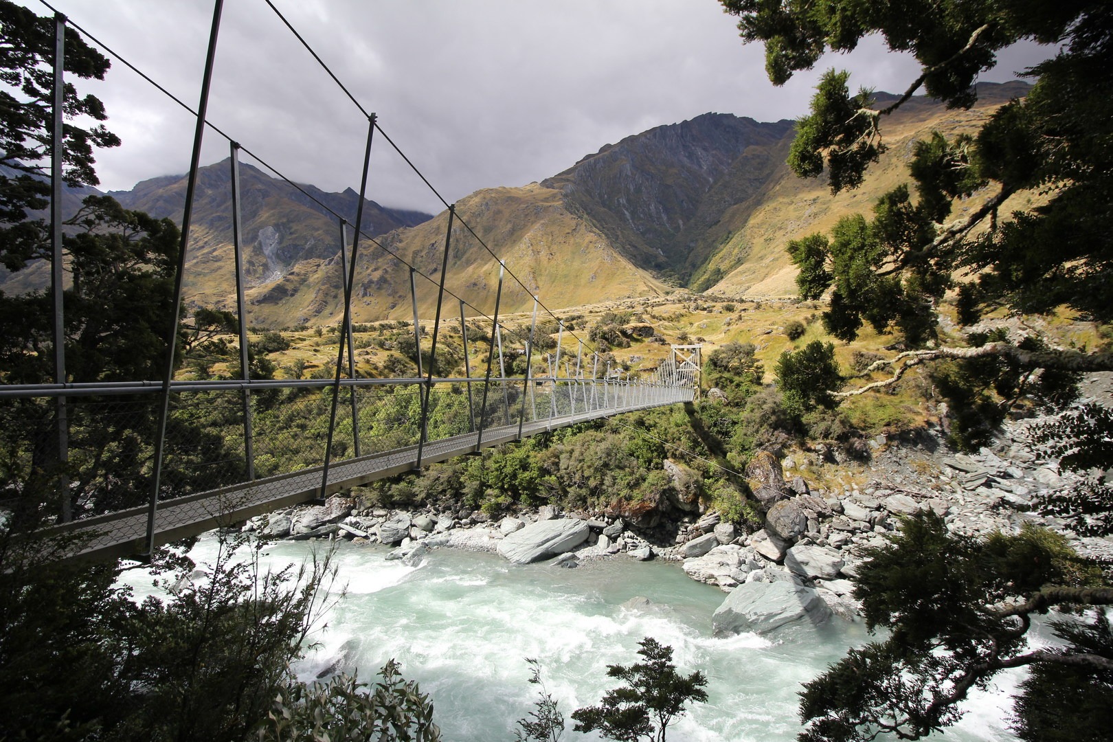 After leaving the grasslands, the trail enters thick forest for most of the remainder of the trail. A few viewpoints exist, and several landslides also allow hikers to take in the glaciated mountains of Mount Aspiring National Park. The trail ends in a meadowland completely surrounded by towering mountains with glaciers and waterfalls on three sides.