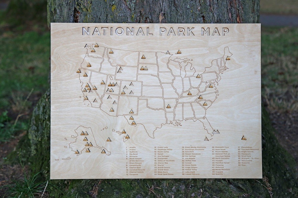 Keep track of your national park visits with this handcrafted wooden map from PTO Studio.
