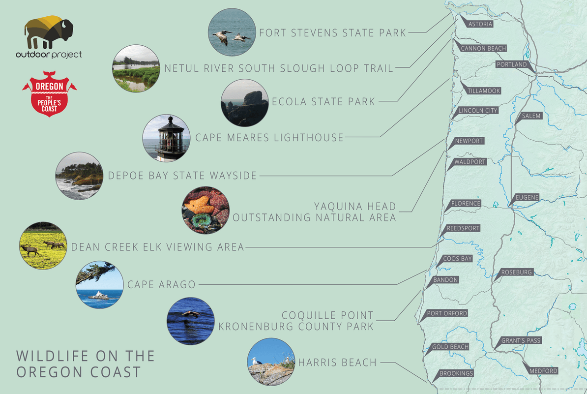 Take your time as you move down the coast to explore all the different animals available to view here. With plenty of informational signs and visitor centers, you'll soon be recognizing the distinctive creatures that call Oregon home. As you enjoy the wildlife along the coast, please remember that you are a guest in this incredible and delicate habitat. Always give wildlife space; when an animal moves because it is uncomfortable with your proximity, it is using valuable energy that it may not be able to spare. And while it may be tempting to get a closer look at the wildlife on sea stacks and refuge islands, these are strictly off limits for humans, not to mention dangerous. It is best to skip the ticket or the injury and bring binoculars, a spotting scope, or a telephoto lens to get close to the action.
