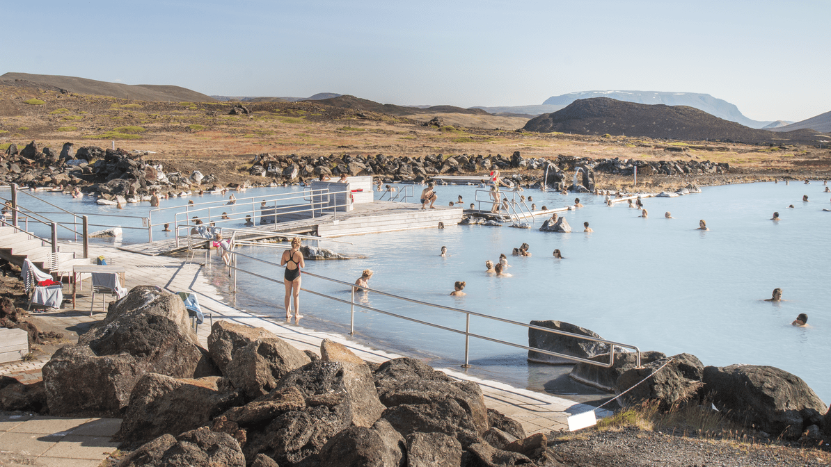- Mývatn Nature Bath: This beautiful alkaline lagoon is heated by the natural geothermal activity of the region and surrounded by a colorful landscape. The water is cloudy due to various minerals that are believed to have healing properties, and it is built up with a sand and gravel bottom. There are two steam baths, a natural sauna, and an enclosed restaurant. Staying a week in the winter will almost guarantee you an opportunity to experience the Northern Lights!