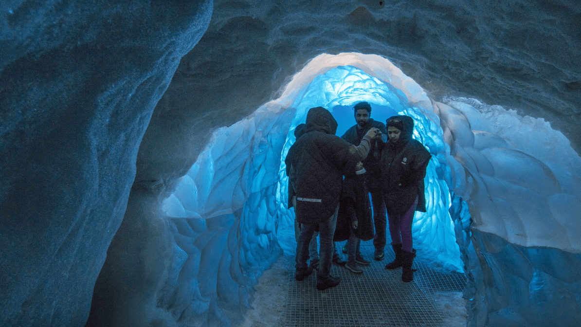 Warm flowing water from seasonal glacial melt forms miles of underground tunnels and caves beneath thick and hardened winter ice. These inner walls can range from opaque white colors to clear crystal blues. It's an unbelievable experience to know that you are potentially exploring realms that have been frozen in time for thousands of years: