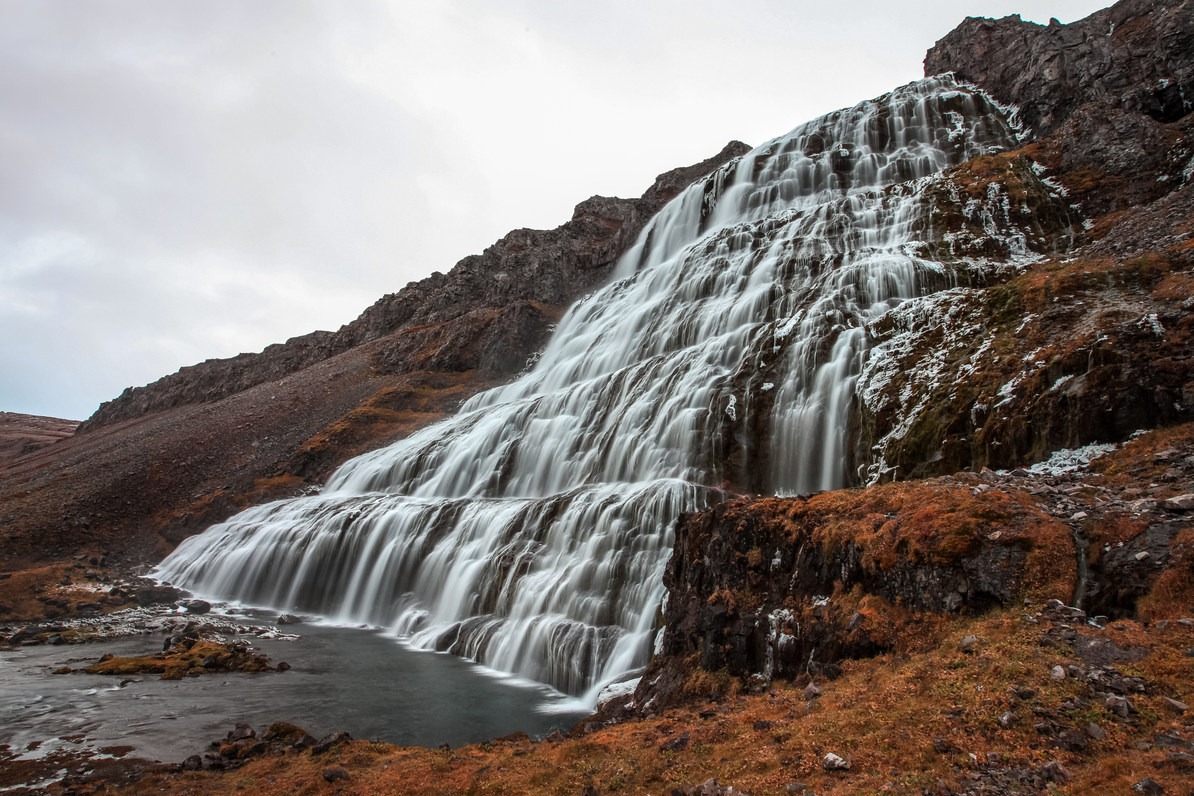 This is another iconic Iceland waterfall located in the country’s Westfjords (Vestfirðir). The main features are a cascading set of drops that total to over 100 meters (328 feet) in height. Water crashes down the mountain in a trapezoidal shape that spans approximately 30 meters (98 feet) wide at the top and widens to about 60 meters (198 feet) at its bottom. A well-defined path leads from the base of the falls up a grand staircase of basalt to the massive upper section of the falls.