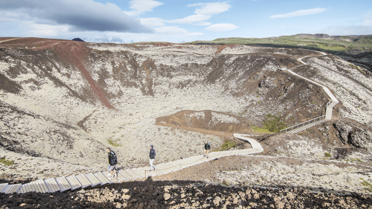 This national monument is another former hot zone comprised of three volcanic craters called Stóra (big) Grábrók, Litla (small) Grábrók, and Grábrókarfell. It is estimated to be over 3,600 years old, and it rises over 100 meters (328 feet) above the landscape. A constructed pathway allows you to get up close to this interesting geology and view the surrounding land from the edge of the former Grábrók Volcano.