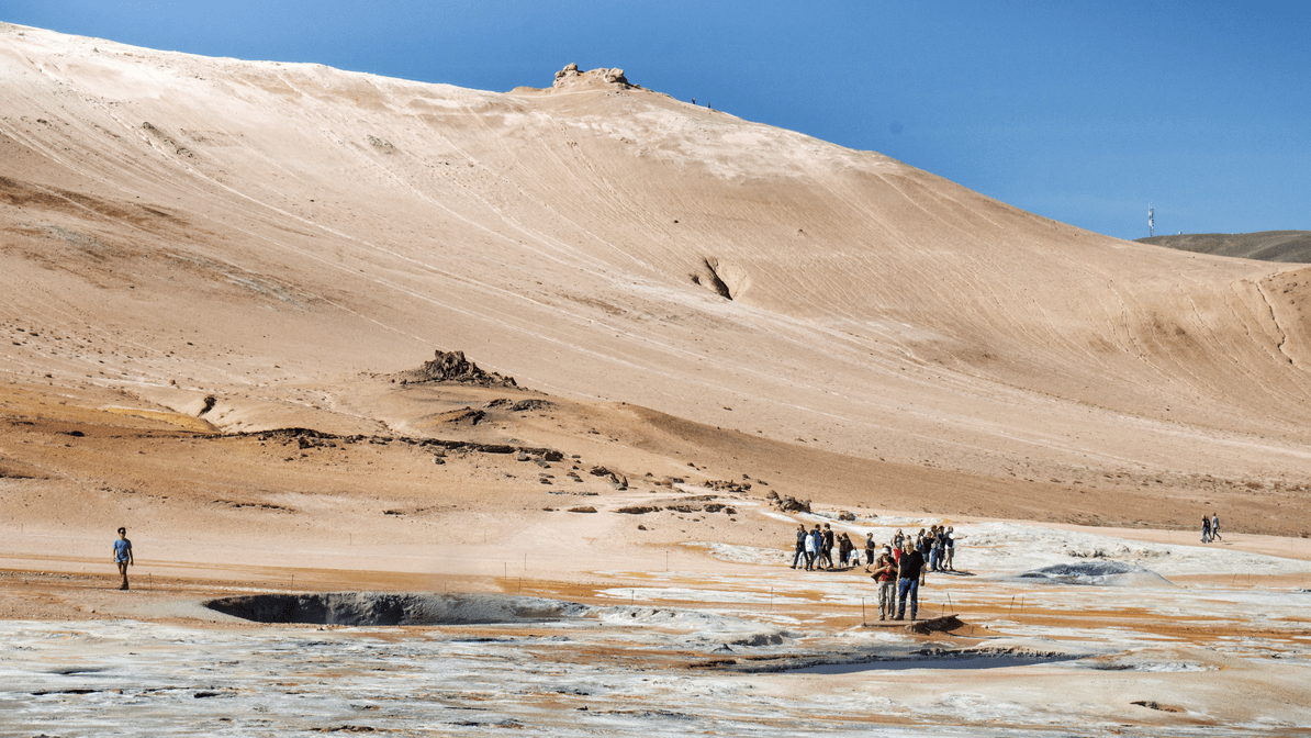 Námafjall is a high mountain immediately to the west overlooking the field. There is a heated trail to the top, and many visitors choose to climb to the summit for its spectacular views of the region. From the peak, you can enjoy the incredible landscape variety of the Diamond Circle. A series of trails connect to this point, so you can extend your adventure. One of them crosses Route 1 to the Námaskarð Pass and continues to the north.