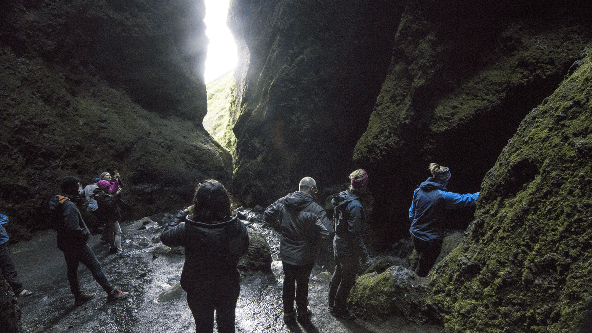 This natural fissure on the Snæfellsnes Peninsula extends inside Mount Botnsfjall and is overwhelmed with a glacial melt stream. From the parking area, a marked trail climbs 125 meters (410 feet) over 0.5 kilometers (0.3 miles) up a valley to a minor waterfall and a narrow passage that leads inside the mountain. Inside, the space widens into a majestic grotto covered from the ground to the sky in a bright green moss. Overhead the canyon lets in a window of light giving the walls and floor a mysterious glisten. The gorge continues for several kilometers, and you are welcome to continue your exploration at your own risk. You will probably need waterproof shoes and clothing because the path may have several inches of water and there are continuous drips from overhead.