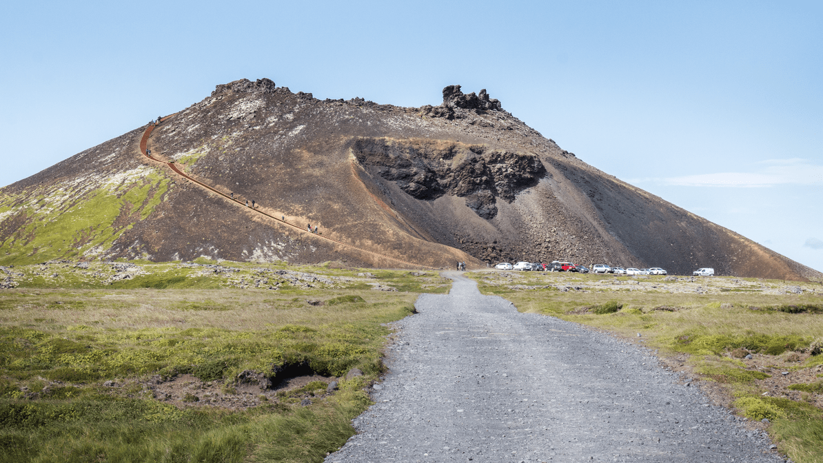 This striking volcanic crater protruding from the landscape was formed between 3,000 and 4,000 years ago. It’s located near the southern tip of the Snæfells Peninsula in Snæfellsjökull National Park and rises 109 meters (358 feet) above sea level. A walking path with steps to the summit was constructed to help preserve this precious natural formation. From the top there is excellent visibility of the Snæfellsjökull Glacier to the east and the tip of the peninsula in the North Atlantic to the west. The magma that once spewed from here covers the landscape as far as the eyes can see.