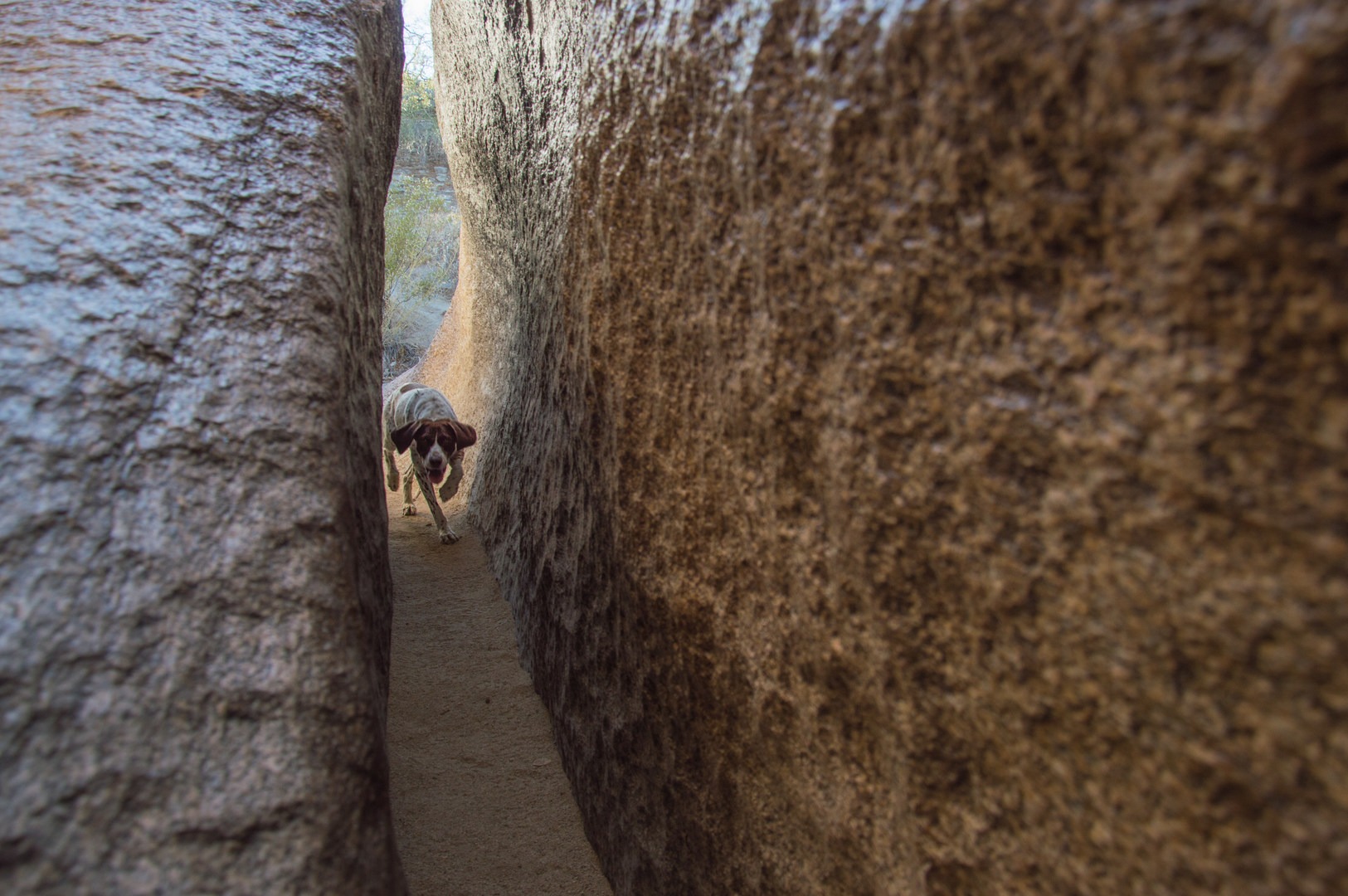 The hike along National Trail is pretty rewarding itself. It passes through a healthy saguaro forest growing among the many rocky outcrops atop South Mountain. It is nearly 2 miles from Buena Vista Trailhead to the junction of Hidden Valley Trail, where Fat Man's Pass is located, but the way is fairly easy. It follows rolling terrain with only a few rock stairs as obstacles. The pass isn't immediately visible from the main trail, but it is not hard to find. When you reach the signed junction with Hidden Valley, turn right and go down a little hill to find the boulders.