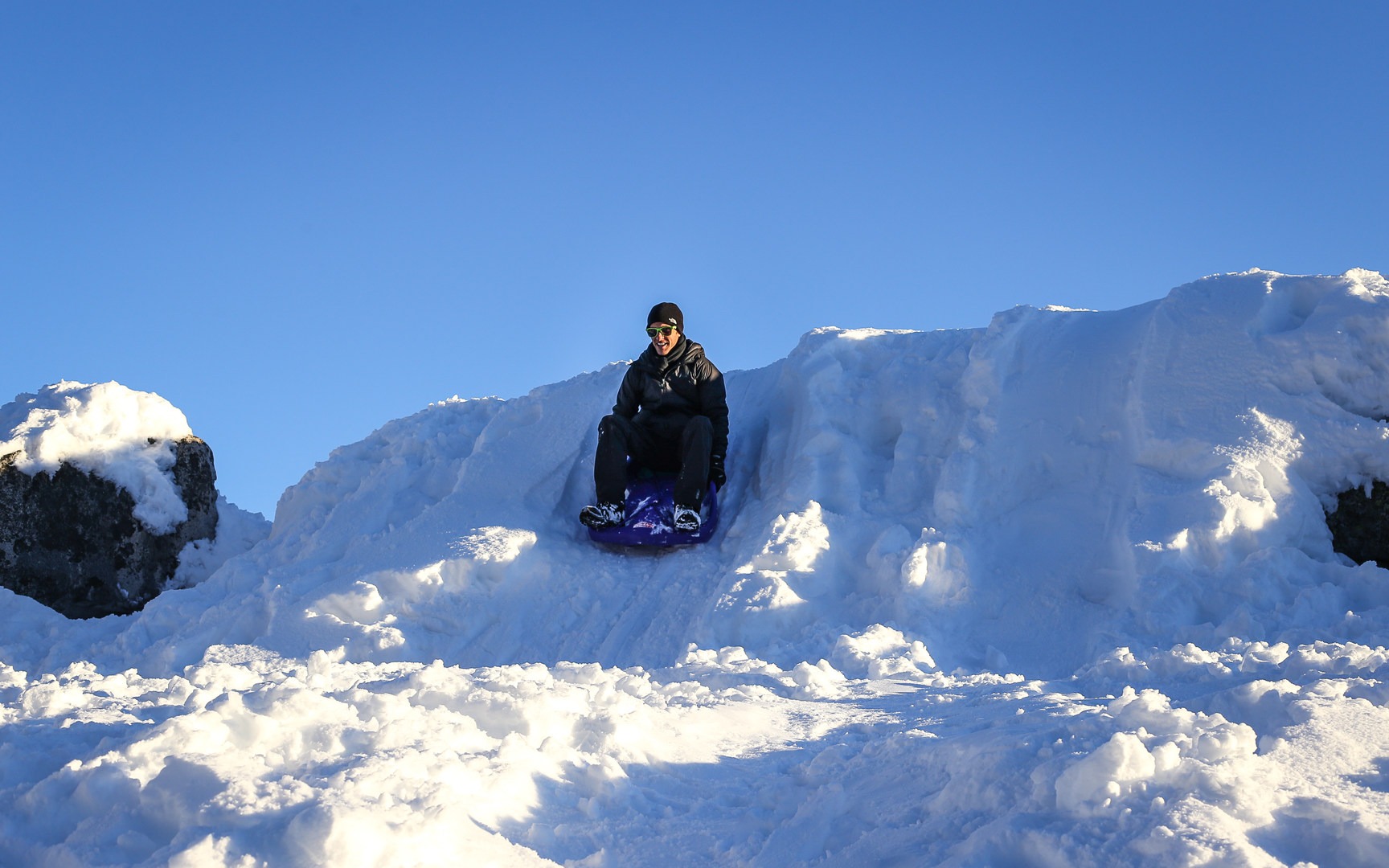 The sledding area is one hill with large slopes that cascade gently down toward the South Yuba River, though the grade varies from steeper slopes near the top to the lower gentler downhill that is perfect for children. A 65-foot elevation difference between the top of the hill and the bottom end of the sledding area allows riders to go for a good distance before coming to a stop. Just be careful of the numerous snowmen that have been built throughout the area!