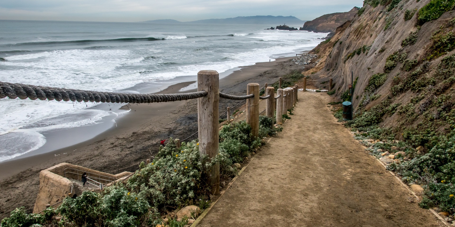 Esplanade beach is a very accessible suburban off-leash dog beach in Pacifica. This small stretch of sand is only exposed at mid-to-low tides, and the long, steep (but wide and smooth) path down from the street is a crowd deterrent. For those with dogs or who don't mind dogs, this is a nice, secluded bit of shore that feels much further from the city than it is. With fine views up and down the coast and interesting eroding cliffs, it is a pretty scenic place to spend a quiet hour with the raging surf. It is rarely crowded even though it is small, and the area to the left around the access path is often empty. There are a few benches set on the southern landings of the switchbacks, so the views and solitude can be enjoyed even by those who choose not to go all the way down to the beach.