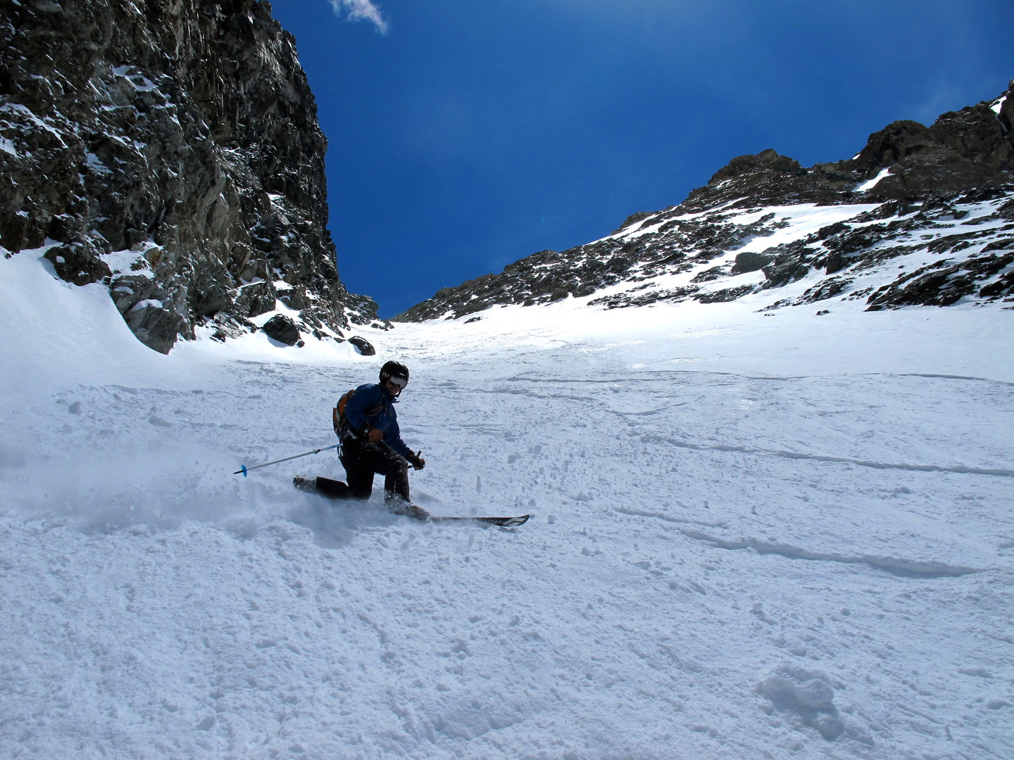 Descent options range from gradual open faces backtracking along the ascent route to steep couloirs dropping down to the Dana Glacier. The most popular couloirs are the north facing Dana Couloir and east facing Solstice Couloir (which at times can develop a precarious cornice at the entrance). For those looking for additional turns, many link Dana or Solstice Couloir with a hike up to and across Dana Plateau to a descent of nearby Ellery Bowl.