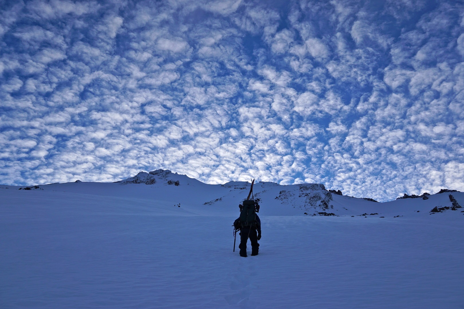 The West Face route begins from the same Bunny Flat trailhead as Avalanche Gulch and shares the lower section of the trail to the Sierra Club Hut at Horse Camp. Those attempting the West Face will bear left at the hut and most frequently head for camp at Hidden Valley. From the hut it is approximately 4 miles and roughly 2,300 feet of net elevation gain to Hidden Valley, depending on route. The route to Hidden Valley is unmarked, but the route finding is relatively straight forward as it traverses around the toe of Casaval Ridge before climbing up into the valley. The difficulty of the route will be condition dependent: Conditions that are either free of snow or that allow for good skinning are best. Traversing into hidden valley in soft, slushy snow is a brutal undertaking, and it makes the final leg across exposed talus slopes very perilous. An alternative route, which was done in this adventure, involves ascending one of the bowls between Casaval Ridge and Cascade Gulch and dropping in on Hidden Valley from above.