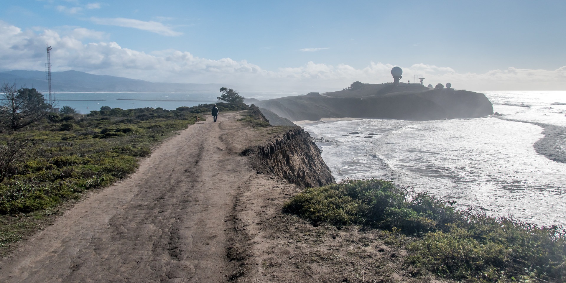 The parking area for Pillar Point is often full, even on weekdays. This is especially true when big waves are breaking. However, patience will usually yield a parking space because people come and go frequently. From the parking lot the trail to the bluff begins across the road at the yellow gates. Hop these gates and walk up the road until a well-defined path forks off to the left and up the bluff. Once at the top, the trail goes along the edge for a half-mile or so. There are several other trails on the bluff that are easy to follow due to the lack of high vegetation, making several possible loops to walk. Portions of the trail along the bluff are eroded away, so pay attention to trail closure signs to avoid these areas.