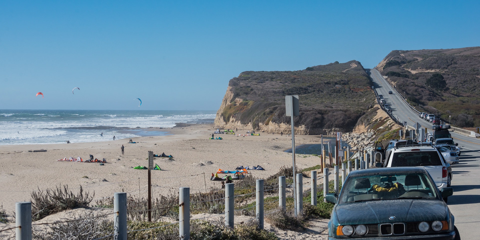 Kiteboarding/windsurfing hotspot. Wide beach. Short drive from Santa Cruz.