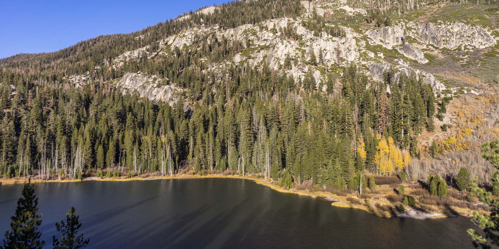 The hike starts at the simple picnic area on a low bluff overlooking the lake (shuttle stop #7). As a loop it can be hiked in either direction, but it is a bit easier to navigate going counter-clockwise. After a flat section along the lake, the trail climbs a few switchbacks to the top of a small granite knoll above the lake. There are great views of the far shore and the granite hillside beyond. Climbing down to lake level, the trail crosses the outlet creek, and just past this is a lovely small waterfall.