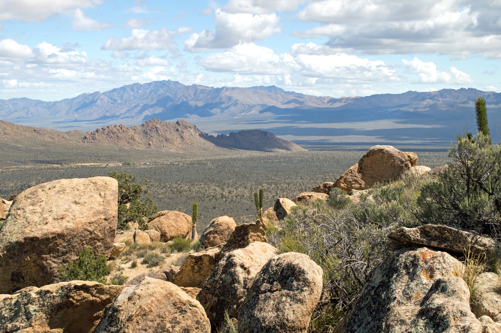 About a mile into the hike the Tutonia Peak Trail crosses a dirt road that leads to mines in both directions. The southern track leads to Teutonia Silver Mine, which was abandoned in 1906 after only 10 years of use. The entrances to all of the mines in this region, including Teutonia, have been sealed as a safety precaution. Soon after passing this intersection, the trail becomes much steeper, follows a series of switchbacks, and rapidly gains 750 feet. As the elevation increases, the surrounding habitat changes as well. Instead of Joshua trees, the rocky peak is home to pinyon and juniper trees, sagebrush, and prickly pear cacti. At the summit hikers are rewarded with spectacular, nearly 360-degree views of the surrounding Mojave Desert.