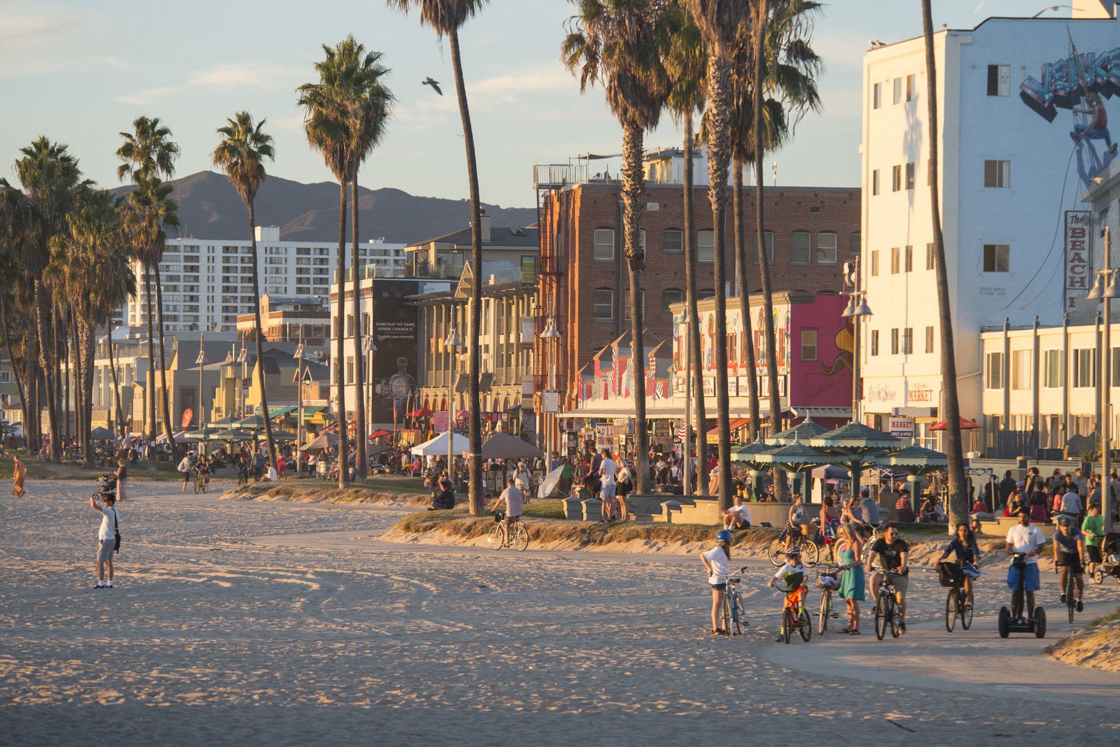 Venice Beach is a destination for surfing and enjoying the sun year round. With a 2.5-mile, pedestrian-only promenade, it is also a destination for plenty of unique shops, bars, and restaurants. Aside from the shops, surfing, and swimming, bike rentals are available for an easy ride between Venice Beach and Santa Monica. Other attractions of the area include a skate park, a famous beach-side gym, the Venice Pier, and an extensive canal system.