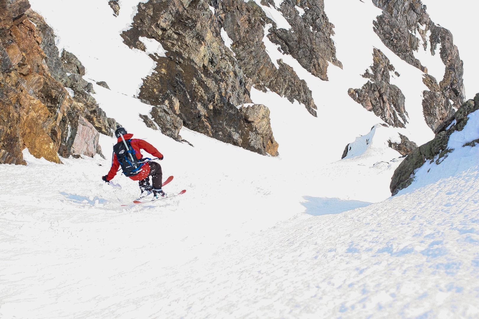 As you approach a break in the cliff, you intersect the descent of Superstar on the south aspect of the northeast cirque. From the intersection you have to ski carefully and mitigate your sluff as you descend above multiple cliff bands. Exiting onto the apron, you shift from precise, technical turns to wide open carves as you exit avalanche terrain and into the cirque below. Stop at the bottom to appreciate the technical and somewhat exposed line before applying your skins to tour back out.