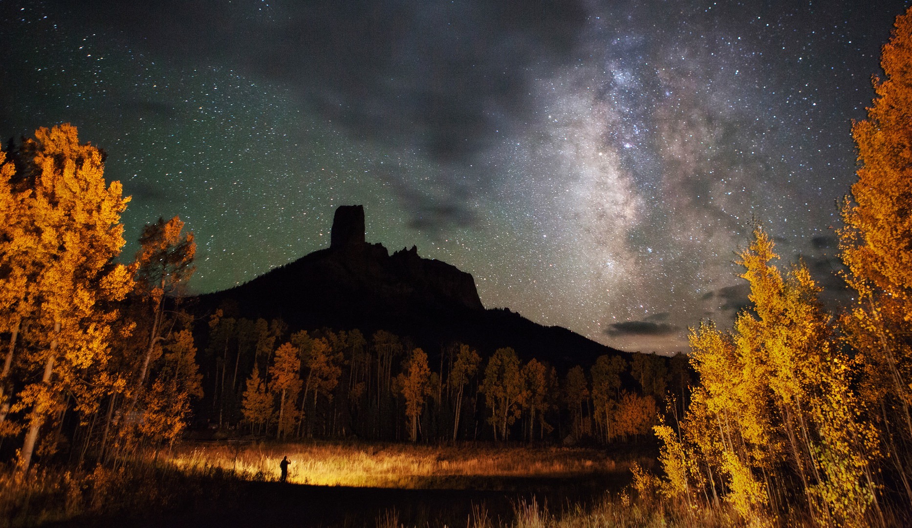 The road starts off of US-550 just north of the town of Ridgway and south of Ridgway State Park. It is a dirt road that is generally accessible to all vehicles –though when wet or snowy, it is a good idea to have a high-clearance, four-wheel drive vehicle. The road has moderate traffic and can be muddy in spots. As you approach the pass, the most prominent peaks in the Cimarron Range are Chimney Rock (11,781 feet) and Courthouse Mountain (12,152 feet). The first mandatory stop is the Vista Point, which is 8.8 miles from US-550. It is a great spot to watch the sunset. A short walk along the trail southwest from the parking lot will lead you to a spot where there are oak groves and golden aspen in the foreground, spruce and fir closer to the mountains, and the rocky peaks in the background.