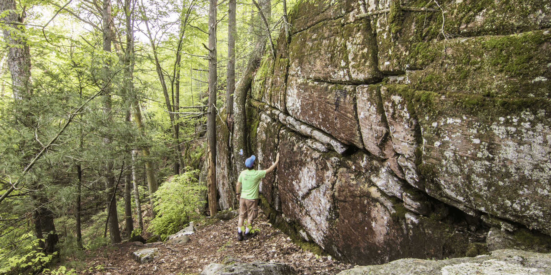 If you would like to extend your journey, follow the path up the hill and look for the next sign that shows the Alternate Trail to the right. You’ll cross a stream and pass along more rock faces until you reach a wide gravel road.  Follow the road east and look for the blue markers that will be on your left. Be sure to take this trail if you are ready to make your return and complete this loop extension. Blue markers also lead to the right and will take you to Fat Man’s Pass, which is not a loop trail.