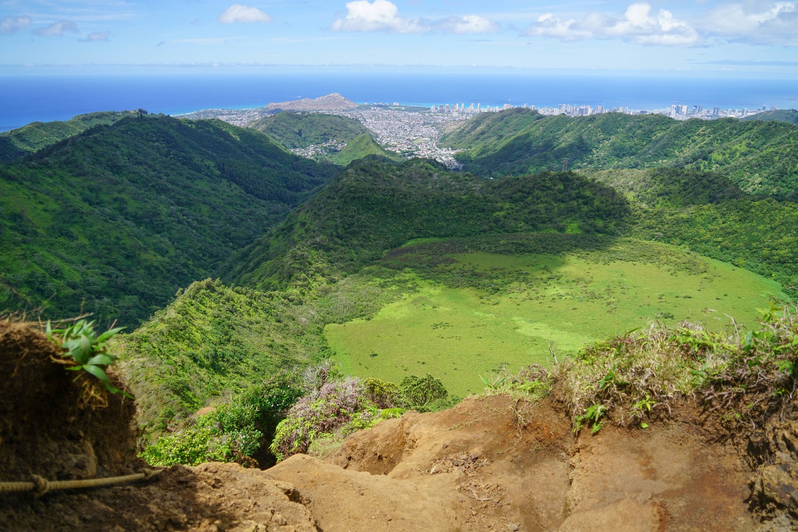 Continuing up the crater rim, hikers cross some washed out and narrow sections of the ridge. Erosion and rock slides have made this portion of the trail difficult and dangerous, depending on the conditions. Ropes are in place for the steepest section, just below the summit. At the summit clearing, a sweeping panoramic view of the windward side of the island is awarded on clear days. To the east, Kailua, Lanikai and Olomana (three peaks). To the north, Konahuanui (K2) and Mount Olympus. To the west, Diamond Head, downtown Honolulu, Pearl Harbor and the airport.