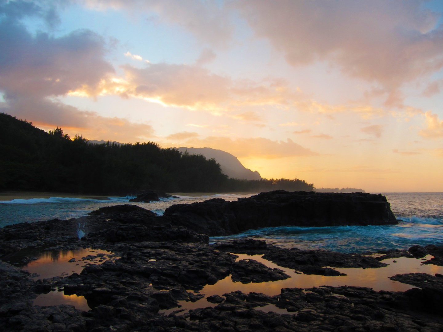 Situated on the north shore of Kauai, Lumaha’i Beach offers exceptional views as well as exceptional displays of nature. From this beach you look out over a curvy shoreline and jagged rock formations to the Pacific with a backdrop of steep vocanic rock cliffs. In addition, large waves are known to hit this area, especially in the winter. Combined with the sloped, sandy beaches and ocean currents, Lumaha’i is often considered unsafe for swimmers. While conditions are not always optimal for your average swimmer, many people, especially locals, still swim, bodyboard, and surf at this location.