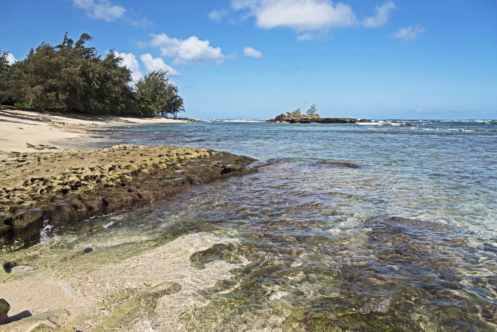 Waiale'e Beach Park is located on the North Shore of O'ahu and is not to be confused with the Waialae Beach Park near Kahala on the South Shore. This is a small white sandy beach with some tide pools and a little island right off the coast. There is no surf here, and this is not a popular beach by any means, but it's perfect for anyone looking to get away from the crowds at the famous beaches nearby. This is one of the most eastern beaches on the popular stretch, so it's an easier trek for people living or staying on the windward side of O'ahu. There is a bunch of parking considering how rarely people come here, and there is plenty of shade for a long stay. The water isn't too rough here other than in the winter, and there are some rocky areas to walk around and check out the little fish in the tide pools. You can swim out to the island, but there is no beach and the waves crash steadily on the rocky coast, so be careful.