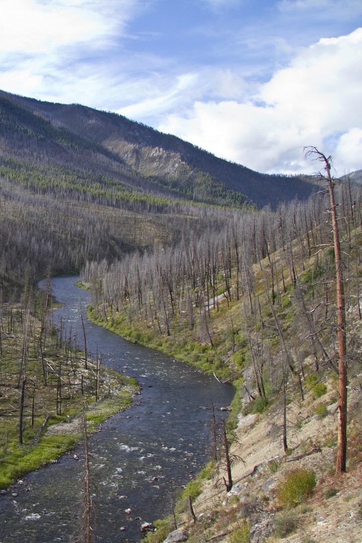 Trails are impacted by wildfire. The intense heat breaks up the soil, providing an opportunity for colonizing grasses and shrubs to encroach into the existing tread. Fire-killed trees eventually fall, often criss-crossing the trail. In steeper sidehill sections, loose rocks and soil falling from above can bury and obscure the tread. On remote and infrequently maintained trails like the one along the Middle Fork, hiking through old fires scars can be a bit more challenging.